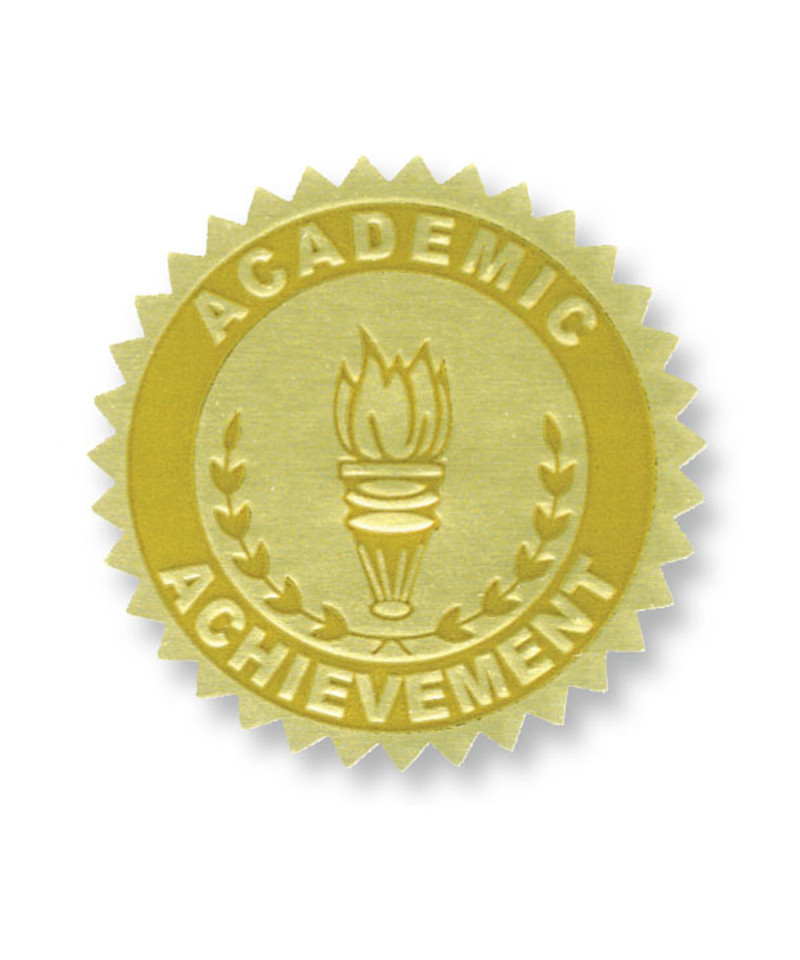 Academic Achievement Gold Foil Embossed Certificate Seals are gold foil embossed certificate seals add an extra touch of class to any certificate, award or diploma! Embossed with Academic Achievement and decorated with a flaming torch and laurels for that special day. Also great for prizes and bulletin boards. Ideal for any Hayes award, certificate or diploma. Measures 1 3/4" diameter. Each pack includes 54 self-adhesive seals.