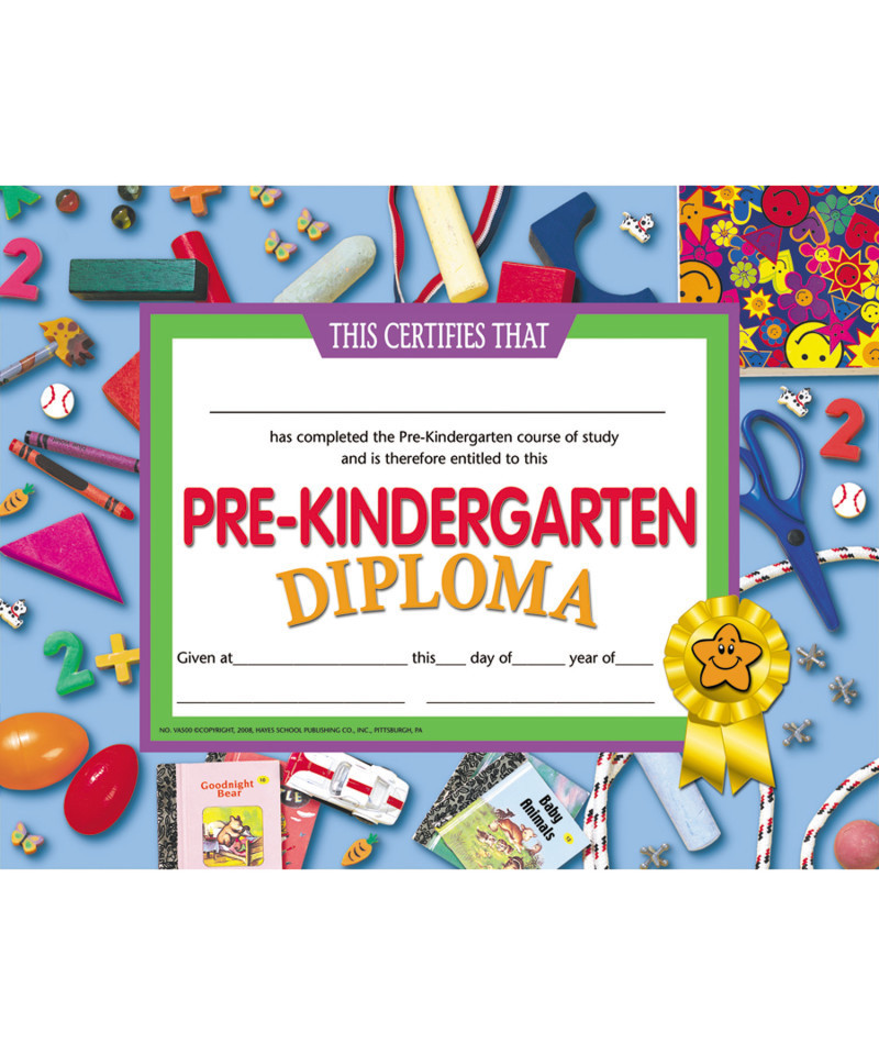 Diploma reads: This Certifies That _____ has completed the Pre-Kindergarten course of study and is therefore entitled to this Pre-Kindergarten Diploma Given at _____ this _____ day of _____ year of _____.