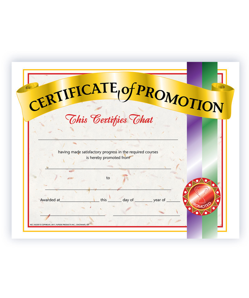 Certificate reads: Certificate of Promotion This Certifies That _____ having made satisfactory progress in the required courses is hereby promoted from _____ to _____ Awarded at _____ School this _____ day of _____ year of _____.