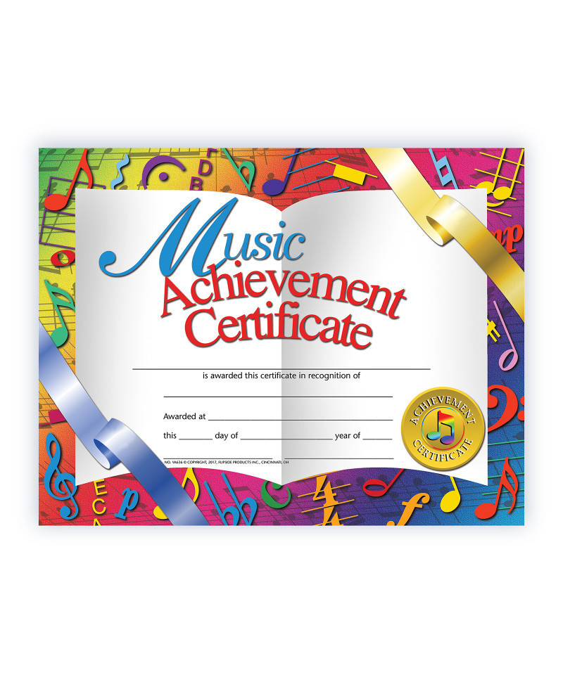Music Achievement Certificate features a colorful background that display different music notes scattered around. This Hayes certificate is a great way to reward a student for their hard work in music class or club. The certificates are great for teachers and administrators to give out at end of the year parties and award ceremonies. They also work great as student and classroom incentives! Theses student certificates are printed in full color on high quality paper. These music achievement awards can be personalized with the recipient's name and information regarding the certificate. The certificates can be handwritten or printed by using a downloadable template. Measures 8.5" x 11". Each pack includes 30 diplomas.