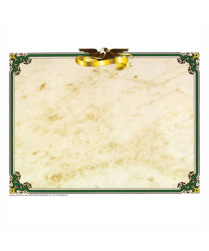 Eagle Border Paper features parchment style paper with an eagle resting on gold ribbon along the top edge. Classic look is finished with green and gold border and ornate corners. Design and create your very own invitation, program, diploma, award or certificate with this original preprinted border and your favorite word processor or page layout program. Our border paper is great for teachers and administrators to use for end of the year certificates and awards. They also make great classroom incentives. Measures 8.5" x 11". Each pack includes 50 sheets.