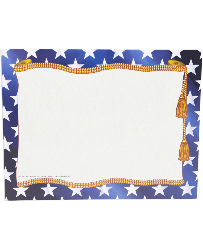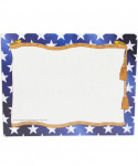 Stars Border Paper features a bold blue with white stars and gold cording and tassels frame around a light parchment center. Design and create your very own invitation, program, diploma, award or certificate with this original pre-printed border and your favorite word processor or page layout program. Border paper can be used as great classroom incentives. The possibilities are endless with our blank border paper. Great for teachers and administrators to use for end of the year awards and certificates for students. Our border paper is printed in full color on high quality paper. This best selling blank paper can be creatively design by hand or printed with a computer program. Measures 8.5" x 11". Each pack includes 50 sheets.