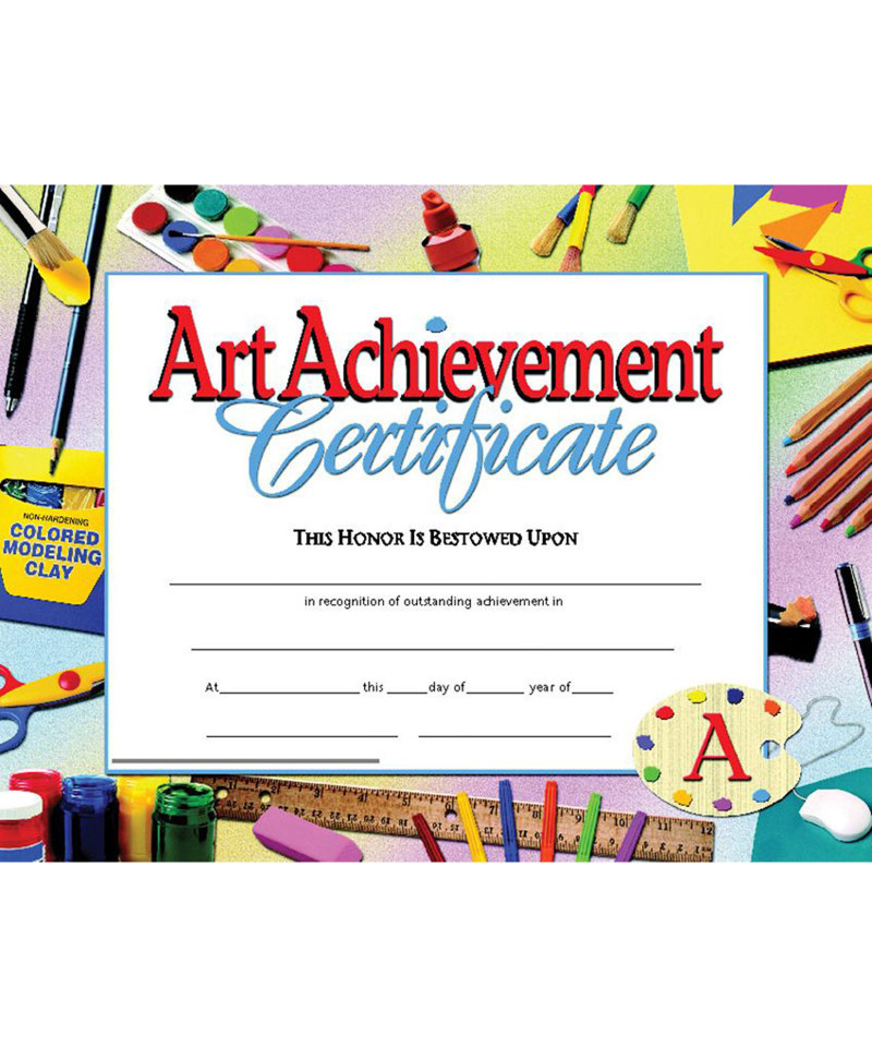 Certificate reads: Art Achievement Certificate This Honor Is Bestowed Upon _____ in recognition of outstanding achievement in _____ At _____ this _____ day of _____ year of _____. These blank achievement awards can be personalized with the recipient's name and other information regarding the certificate. They can be handwritten or printed. Downloadable template is available.