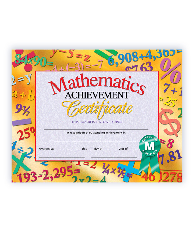Certificate reads: Mathematics Achievement Certificate This Honor Is Bestowed Upon _____ in recognition of outstanding achievement in _____ Awarded at _____ this _____ day of _____ year of _____. This math achievement award can be personalized with the student's name and other information pertaining to the award. They can be completed by handwriting the information or printing it.