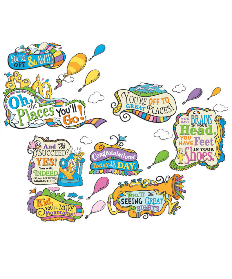 Eureka Dr. Seuss Oh the Places You'll Go Bulletin Board Sets are sure to bring any room to life. With the brightest colors, individual designs and variety of styles, the choices are endless. Set Includes: 8 Quotes, 11 Hot Air Balloons, 8 Clouds.