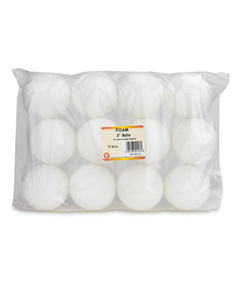 Craft Foam balls are the foundation of many fantastic crafts projects and decorations. Polystyrene Foam is simple to decorate, yet yields professional looking crafts. Use as a base for floral arrangements or craft centerpieces. Teachers love foam balls for science projects and models; you can even create a model solar system with the large selection of sizes! These balls are popular for creating and decorating holiday ornaments and decorations. So get out some tissue paper, sequins, paint and glue, and let your creativity start running! Foam Balls measure 3" in diameter. Each pack includes 12 craft foam balls.