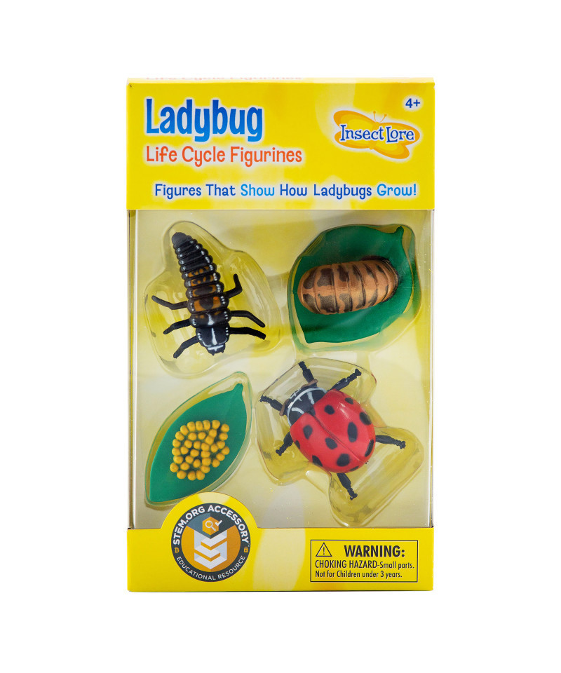 Children can see how Ladybugs change as they grow with Insect Lore's Ladybug Life Cycle Stages. These oversized, anatomically correct figures have been accurately painted and sculpted to show the four stages of ladybug development: eggs, larva, pupa and adult. Each detailed, four-piece set is made of durable, flexible plastic and is fun and educational. Mix them up and encourage your child to place them in the correct order. Useful as a teaching accessory for Insect Lore's Live Ladybug Land® (sold separately). Recommended for Ages 4 and up.