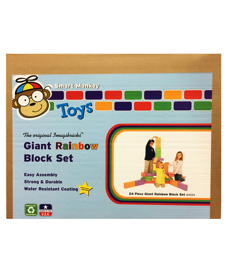 Award-winning ImagiBRICKS™ Giant Building Blocks are an enduring classic that offer endless play possibilities because they are versatile (build with them, jump over them, crash into them) and safe. Constructed of lightweight corrugated cardboard, if the blocks tumble, no one gets hurt! Because these blocks are large, they'll help your child gain confidence, and encourage social play. The blocks are printed with non-toxic inks and with their water-resistant coating are strong and durable for years of creative play. Ages 18 mos.+. Adult assembly required. 24pc set includes: 6 red, 6 green, 6 orange, and 6 purple. 24 large blocks (12" x 6" x 3").