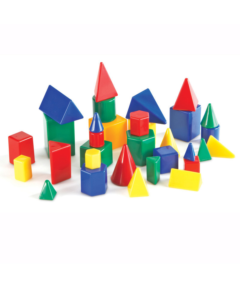 It just got easier to teach shapes, sizes and relationships with these colorful, plastic geometric pieces. Set of 32 includes 4 sizes of 8 shapes: triangular prism, cube, cone, cylinder, rectangular prism, hexagonal prism, triangular pyramid and square pyramid. Perfect for individual or small group use, each shape measures from 1/2" to 13/4". Includes Teaching Guide.