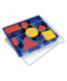 Teach shapes, sorting, patterns, size and counting with these durable plastic blocks. Sixty-piece set includes five shapes, two sizes, two thicknesses and three colors. Set comes in a convenient storage tray with shape sorter that can be used for tracing.