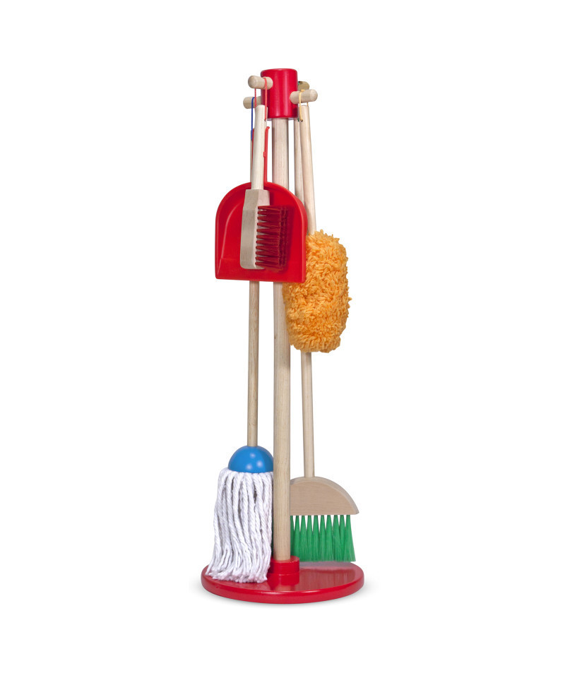 This six-piece play set gives kids all the housekeeping tools they need to keep it clean! Sized just for kids and built to last, the broom, mop, duster, dust pan, and hand brush are comfortable to use and easy to store--just hang them from the sturdy cords onto the included stand for neat, compact storage. (The dust pan can also snap onto any of the handles.) Natural-wood handles add durability and a classic look; bright pops of color keeps lots of fun in the mix!