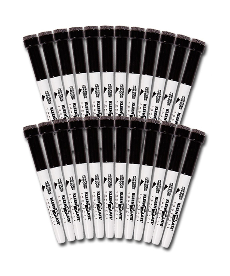 Small dry erase black markers with eraser and round tip. Points of markers don't push in. Markers are filled with 48 hour CAP-OFF Ink. Conforms to CPSIA and ASTM D-4326 standards. Certified non-toxic and low odor. Fits in handle of KleenSlate whiteboards. 24 black markers per pack.