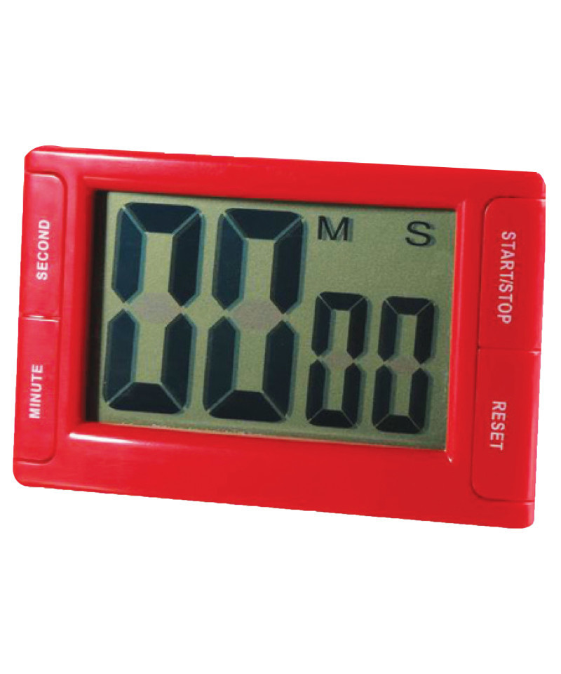 Big Red Digital Timer with Large LCD Display measures 3.75" x 2.5" with a display area of 2-5/8" x 1-5/8". This timer is bright and colorful, and features a stand and four magnets on the back. (1) LR44 Button Battery included. Each timer is packaged in a blister card.