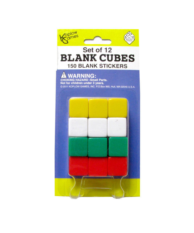 These versatile cubes and stickers allow you to make your own games and activities or replace a missing die. Each pack includes 12 - 5/8" (16mm) blank cube in yellow white, green and red, and 150 - 1/2" circular white stickers.
