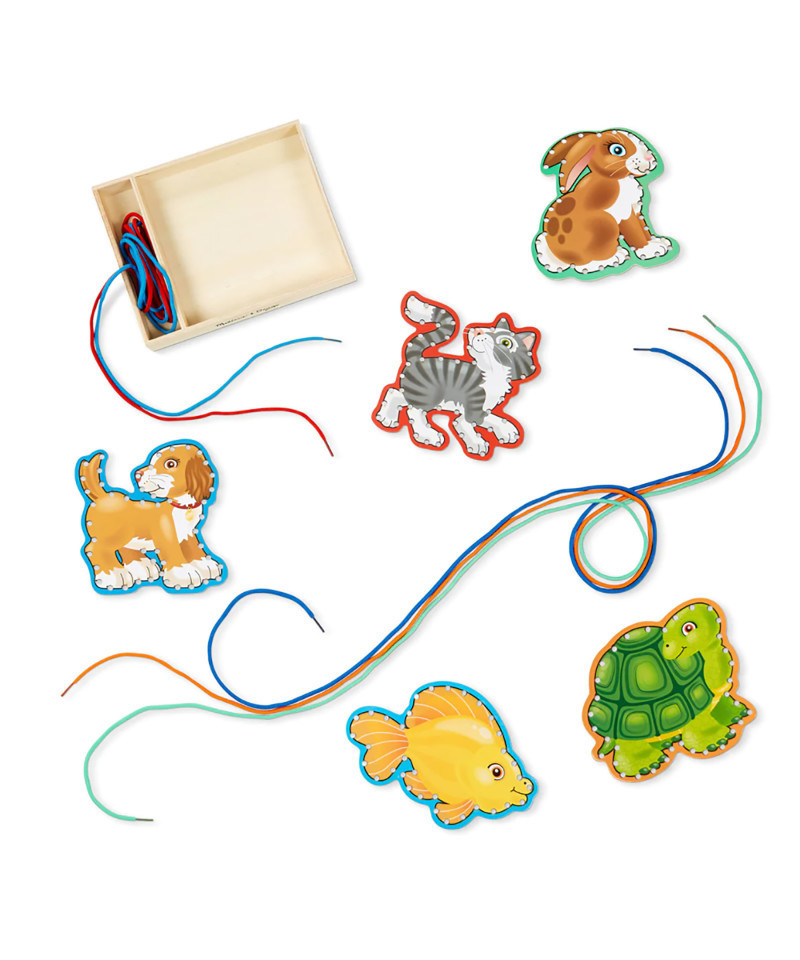With adorable pets pictured on both sides, it's fun to practice lacing and tracing skills. This wooden set contains five sturdy, double-sided lacing panels, plus five color-coordinated laces! Develop hand-eye coordination and attention skills with this great activity.