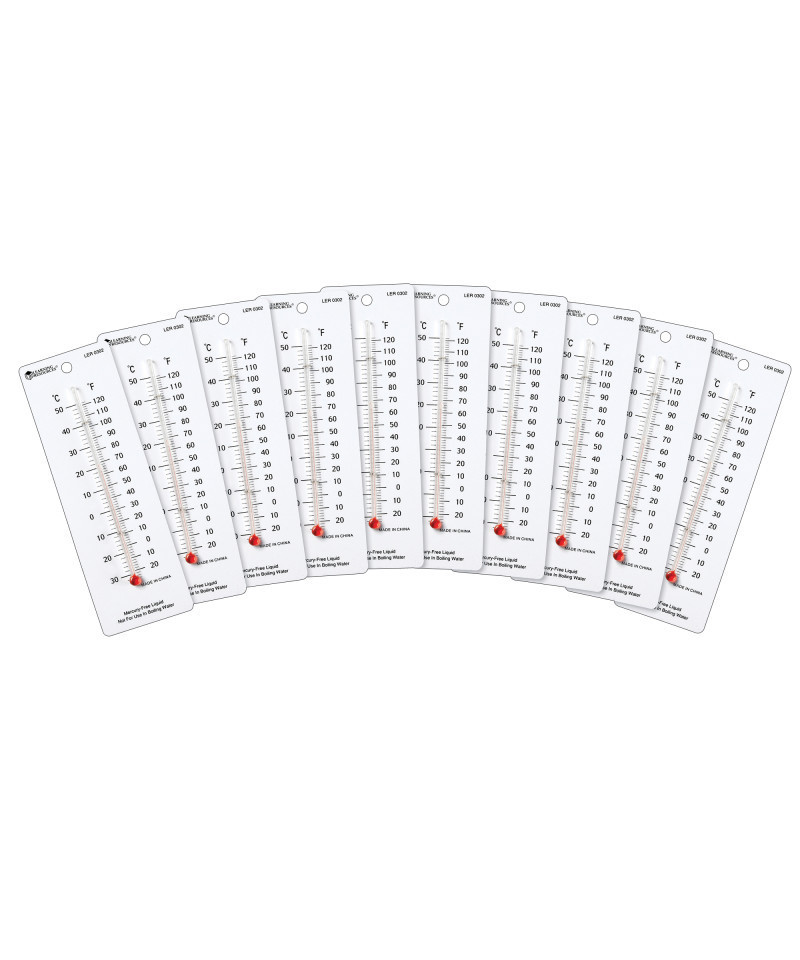 Easy-to-read thermometer measures Fahrenheit and Celsius temperature accurately. 2" x 6" plastic backing. Set of 10.