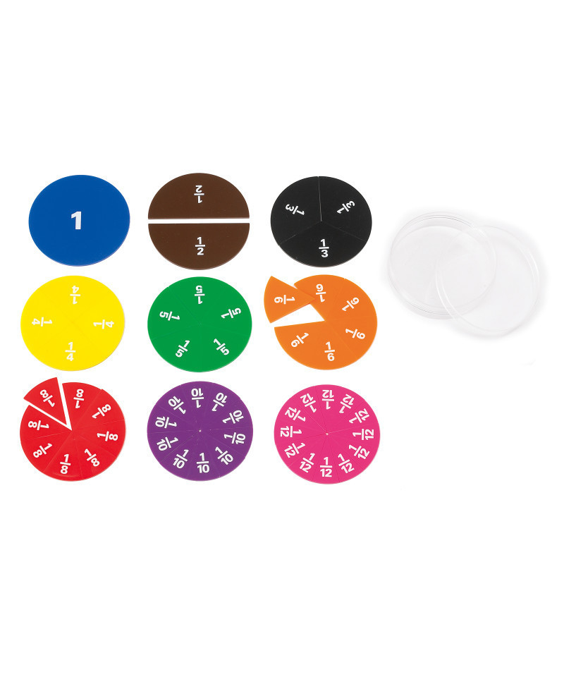 A set of 51 proportionally-sized pieces representing a whole, halves, thirds, fourths, fifths, sixths, eighths, tenths and twelfths in 9 distinct colors with printing on each piece. Packaged in a sturdy plastic case. A whole measures 3.43" diameter. Demonstrate fractional concepts and equivalency models. Students visualize and distinguish the various fractional relationships to form a whole.