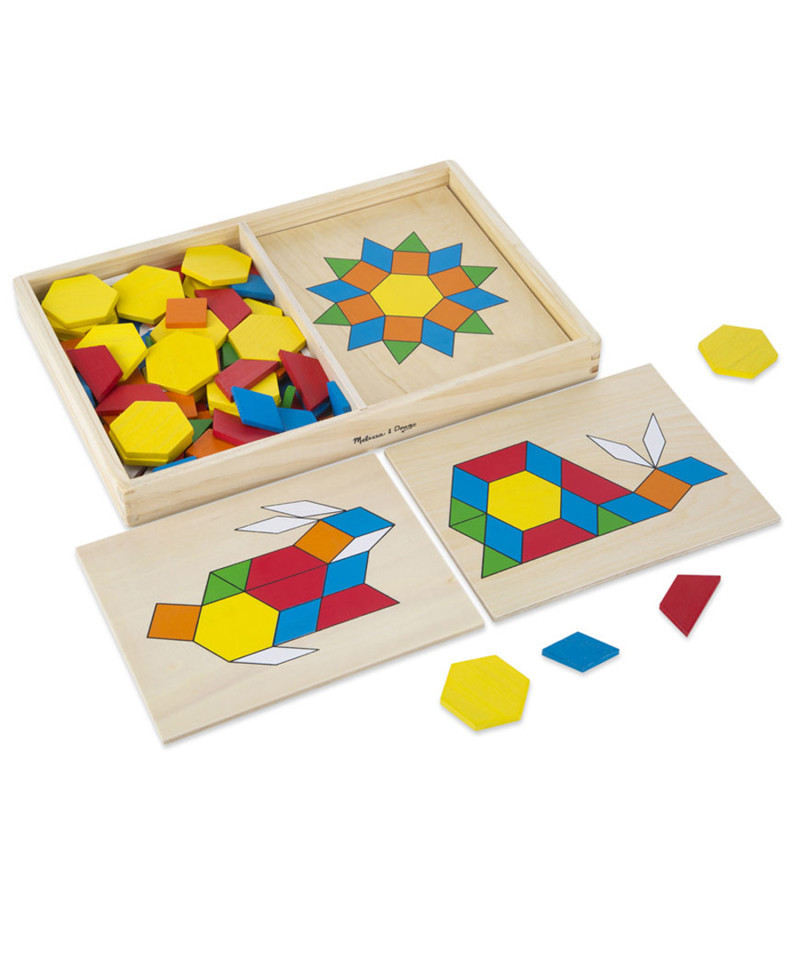 Pattern Blocks and Boards let kids explore shapes and colors hands-on as they fill wooden backgrounds with sturdy wooden pieces! Follow one of 10 design templates or create your own mosaic using 120 colorful wooden tiles in six different shapes. Matching and mosaics--what a gorgeous way for kids three and older to develop fine motor skills!