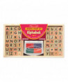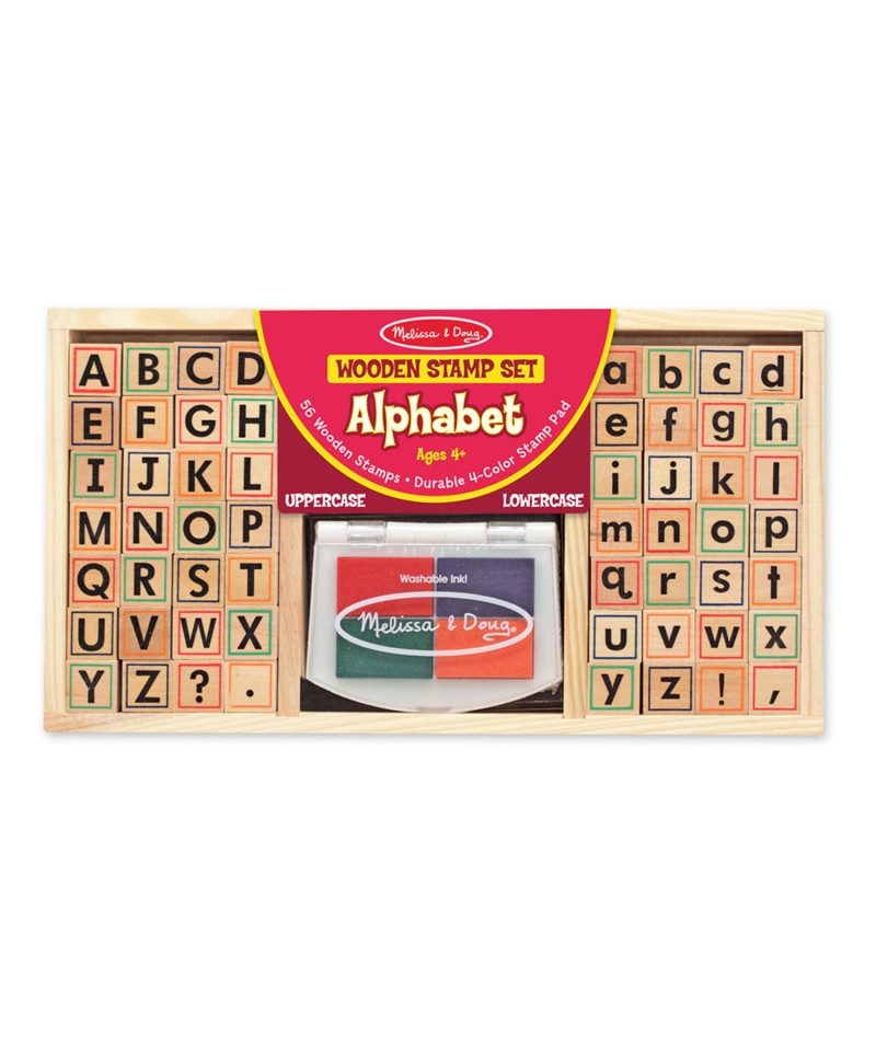 Write exciting messages with this beautifully organized wooden alphabet stamp set. It includes 56 letters (upper and lower case), punctuation marks and a 4-color stamp pad. Keep it neat in the convenient wooden storage tray. WARNING: Choking Hazard - Small parts. Not for children under 3 yrs. Conforms to ASTM D-4236. Product: 1.5" x 6.5" x 12".