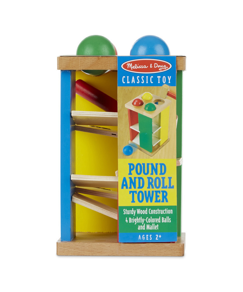 We've taken the classic pounding toy to new heights! Pound the four brightly colored balls through the holes, then watch and listen as they roll, down the ramps. Sturdy wooden hammer included.