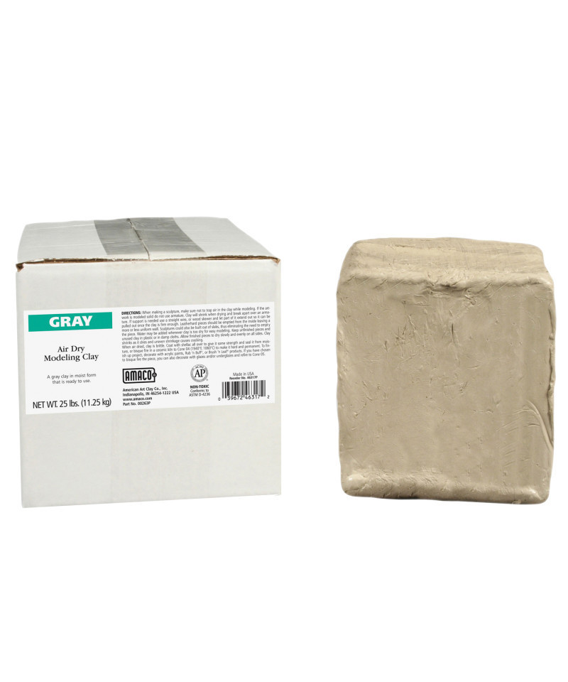 Our inexpensive all-purpose air dry clay is perfect to sculpt, hand model, or throw on a potter's wheel. Air dry your finished pieces slowly and evenly on all sides. Decorate with paint. Seal with shellac for strength and to waterproof. This clay can also be fired to cone 04 for hardness/permanence and to glaze. Includes 25 lbs. of gray air dry clay.