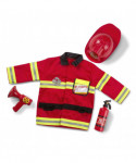 Here is everything an aspiring firefighter needs in an emergency: a bright red, machine-washable jacket trimmed with reflective material, a fire chief helmet, a "fire extinguisher," a bullhorn with sound effects, a shiny badge, and a name tag to personalize.