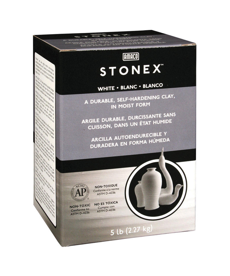 Our premium quality pale white self-hardening clay is formulated for handbuilding, wheelthrowing and sculpture techniques. Knead Stonex to increase plasticity before modeling. Moist, ready to use. Pieces dry hard and durable, but not waterproof. Can be painted. Includes 5 lbs.