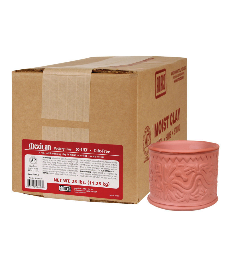 Our rich terra cotta premium quality self-hardening clay is formulated for handbuilding, sculpture and wheel throwing. Modeled objects with resemble Native American or Mexican Pottery with little or no decoration necessary. Moist, ready-to-use. Pieces dry hard and durable, but not waterproof. Can be painted. Keep unused clay in a plastic bag or wrapped in damp cloth to prevent drying out. It will shrink during drying, so it is best to hollow out bulky sculptures or wrap a slab of clay around a loose crumpled paper armature before modeling. Allow the finished piece to dry slowly and evenly on all sides at room temperature and away from heat until hard. When piece is completely dry, decorate with AMACO® Rub 'n Buff®, school paints, temperas, acrylics or liquid crayons. Includes 25 lbs.