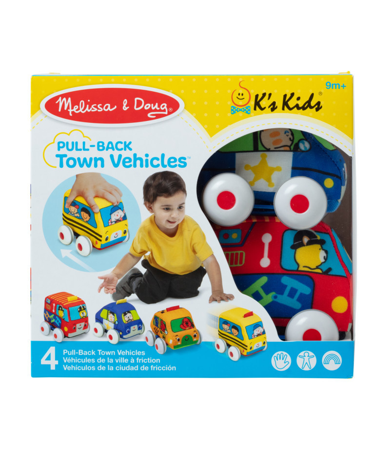 - Melissa & Doug K's Kids Pull-Back Vehicle Set - Soft Baby Toy Set With 4 Cars and Trucks and Carrying Case