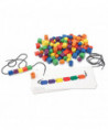 Colorful wooden spheres, cubes, and cylinders provide plenty of patterning practice, a prerequisite for early reading and math activities. Includes: 20 Activity Cards, 108 beads in 6 colors (red, yellow, orange, blue, green and purple). 2 — 36" black laces with 1" plastic tips, Activity Guide. Beads measure 3/4"- 7/8" each. Card measures 11 1/4" x 4 3/8". Grades: PreK+. Common Core State Standards Alignment: Counting & Cardinality, Measurement & Data. Learning Styles: Tactile, Visual. Skill Development: Basic Concepts — Colors, counting, and learning about similarities and differences are all a part of pattern play. Work together with students to group the beads in different piles by color or shape. Then begin to create patterns to help students identify the different attributes and recognize what comes next. Math —As students bead a repeating sequence of colors and shapes, they are creating AB patterning (e.g. red, blue, red, blue). Through patterning, students are beginning to recognize order and predictability. Add to the fun by counting the beads as they are laced in place. Fine Motor — Picking up the individual beads uses pincer grasp and strengthens the muscles in the hand needed to write and perform daily living skills, like getting dressed and brushing teeth. Using two hands to play by holding the lace steady with one hand and picking up and placing the beads on with the other helps develop the ability to use hands cooperatively.