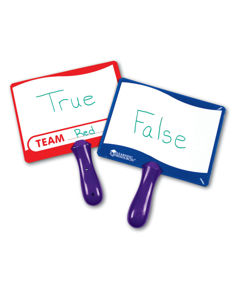 Students love "shouting" out their answers with these double-sided dry-erase boards. The versatility of this board provides teachers, of all grade levels, a fun way of learning in their classroom. Use this board for anything; classroom quizzes, classroom/team games, props in plays, quick answers to teacher questions. Board provides immediate feed back to teachers so they know if their students comprehend the lesson. Sets of 10 boards can be used across the curriculum for everything from class voting to quick-response team games. Five each in red and blue for quick visual team differentiation. Boards measure 8" x 6", with 4" easy-grip removable plastic handles.