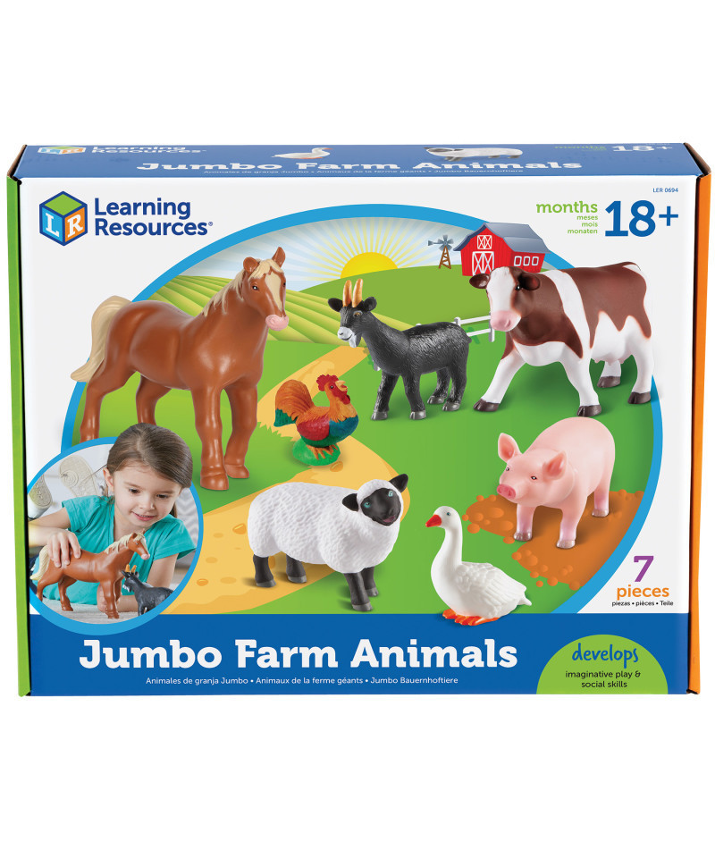 Jumbo farm animals designed for little hands and hours of imaginative play. Realistically detailed figures inspire independent or collaborative play while helping with vocabulary development. Made from durable, non-toxic plastic, each animal wipes clean easily. Activity guide includes facts about each animal and early science discussion starters. Includes: Horse, Pig, Cow, Goat, Sheep, Rooster, Goose. Largest animal (horse) measures 9.5"L x 7.25"H. Grades: Toddler +