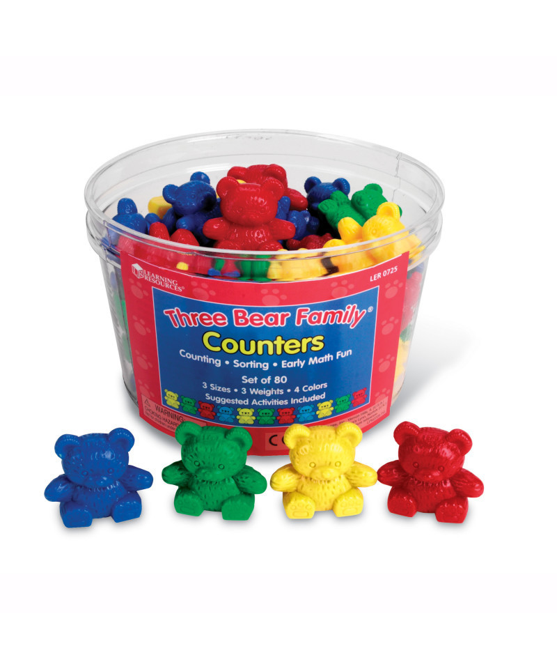 This adorable set of plastic bears comes in three sizes, three weights and four colors. Not only will your little ones enjoy playing with these bears, but learn size recognition, counting and sorting. Bears are also proportionally weighted and can be used on a balance for measurement discoveries. This 80-piece Basic Set contains 20 Papa, 20 Mama and 40 Baby Bear counters in four colors. Packaged in a reusable storage container. Counters measure between 1" and 1.5".