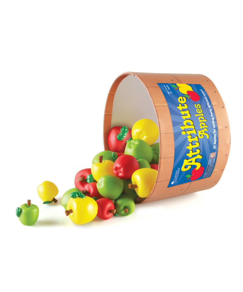 Develop pincer and whole hand grasp by picking up, turning, and studying the apples. Sort, classify, and compare apples by 5 attributes including size, color, and physical features (stem, leaf, worm). Includes activity guide featuring suggested uses of Venn diagrams for higher-order thinking skills. 27-piece set.
