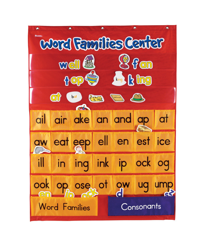 Bright colors and fun images are a great way to teach word families and rhyming. Kids match picture cards with letter cards and do word sorts based on common word families. Heavy-duty pocket chart features three clear pocket rows for card display and 214 coated cards, including die-cut picture cards, word family cards, consonant cards and blank cards. Teacher's Guide included.