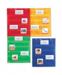 Magnetic Pocket Chart Squares Beyond versatile! Use the 4 charts alone, connect vertically or horizontally with hook-and-loop fasteners to make a larger chart! Great for small groups, centers, combined whole-group displays and more. Features 5 rows of clear pockets for your own cards, plus 2 large storage pockets on the reverse side. Four colors- red, orange, blue, green. Hang with included magnets or grommets. Each chart measures 14"L x 17"H.