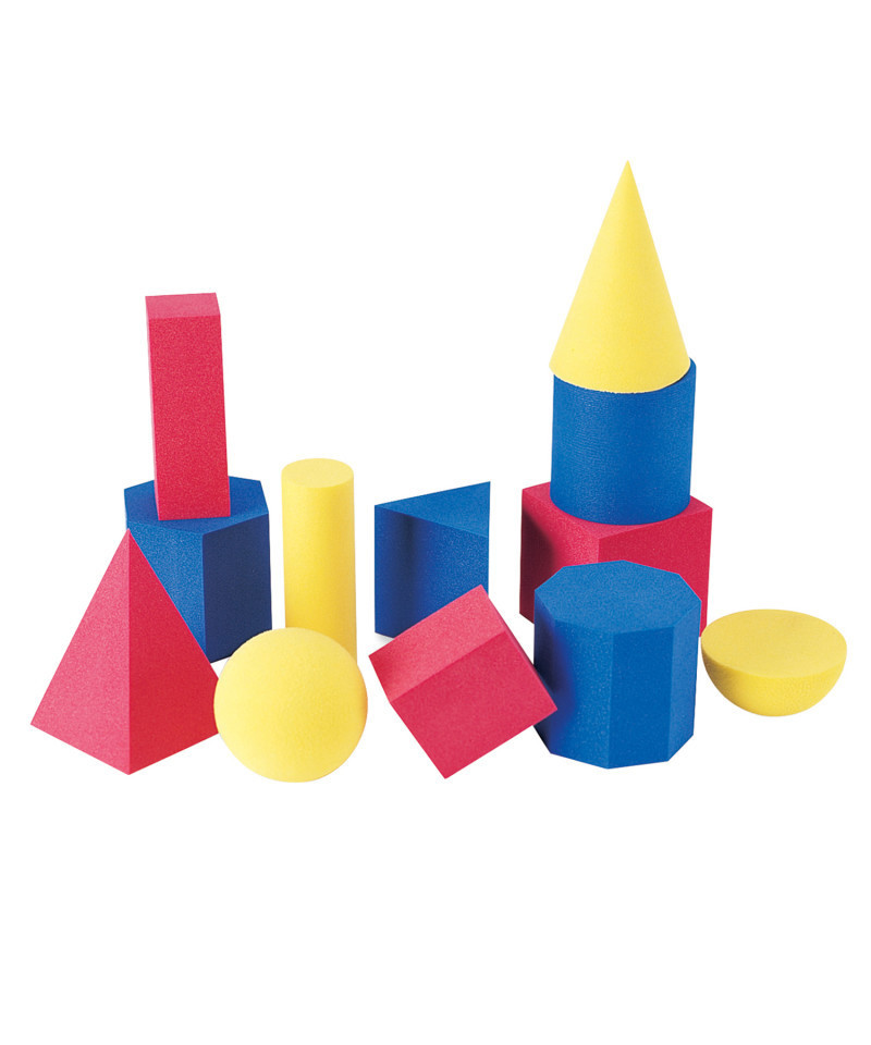 Geometric shapes made of quiet Hands-On Soft™ foam. Shapes come in three colors and measure 2- 3. Set of 12 includes: cones, sphere, hemisphere, cube, cylinders, pyramid, prisms, rectangular solid shapes, storage tub and Teaching Guide.