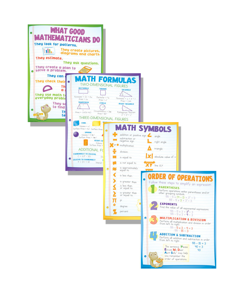 We've taken our best-selling basic math concepts and combined then into one that’s sure to become a teacher favorite. The concepts include the order of operations, math symbols, math formulas, and what good mathematicians do. Includes 4 posters. Each poster measures 17" x 22".