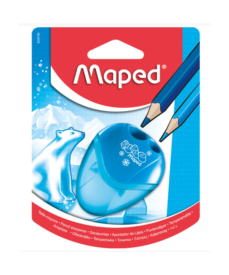 Keep your pencils sharp with the Maped I-Gloo 2 Hole Pencil Sharpener! Featuring 2 high quality steel blades, this classic sharpener makes it easy to sharpen any standard or jumbo sized pencils to a precise tip. The ergonomic design fits easily in your hand for a solid hold during sharpening, and the integrated canister keeps shavings trapped. Transparent, shatter resistant construction makes it easy to see when you have to empty the integrated shavings canister. Sold in assorted colors Blue, Green or Pink (no color choice).