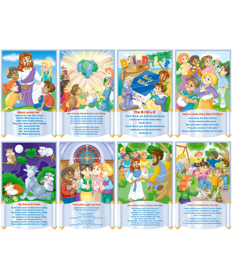 North Star Teacher Resources® Bulletin board set with children's Bible songs theme features popular Sunday school songs and is ideal for toddler through grade 3. Each 11'' x 17'' (27.9 x 43.2 cm) poster features a popular Sunday school song: The B-I-B-L-E, Down in My Heart (Joy, Joy, Joy), He's Got the Whole World in His Hands, Jesus Loves Me, Jesus Loves the Little Children, My God Is So Great, This Little Light of Mine, and Zacchaeus Was a Wee Little Man. Includes a four-page teacher guide with reproducibles. Includes 8 pieces.