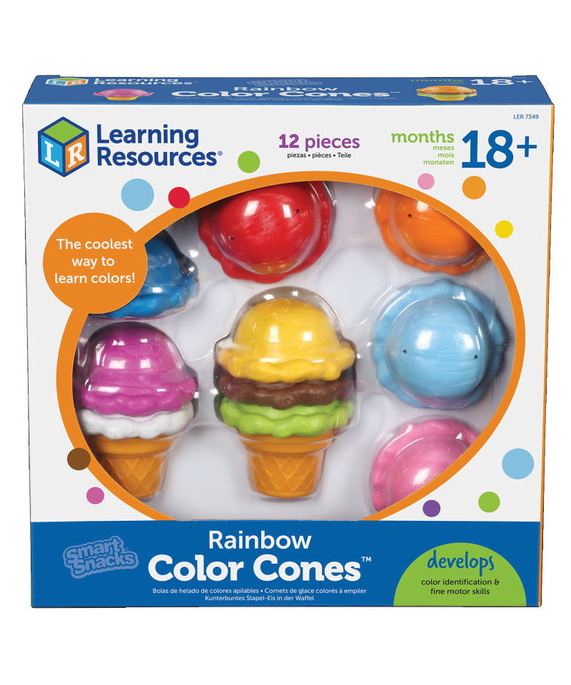 Encourage color identification, build fine motor skills, and hand-eye coordination with this realistic treat. For extended learning, the names of the colors are printed inside the scoops. Updated scoops are easy to stack and feature 10 colors! Includes 2 cones and 10 scoops. Scoops measure 2"L x 2½"H.