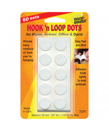 Convenient pre-cut dots. • Strong bonding fastener • Adhesive holds tight to most surfaces • Allows easy removal of attached items • Value Pack... Add to cart Magic-Mounts® Hook 'n Loop, 5/8" Dots, 60 Sets $9.79
