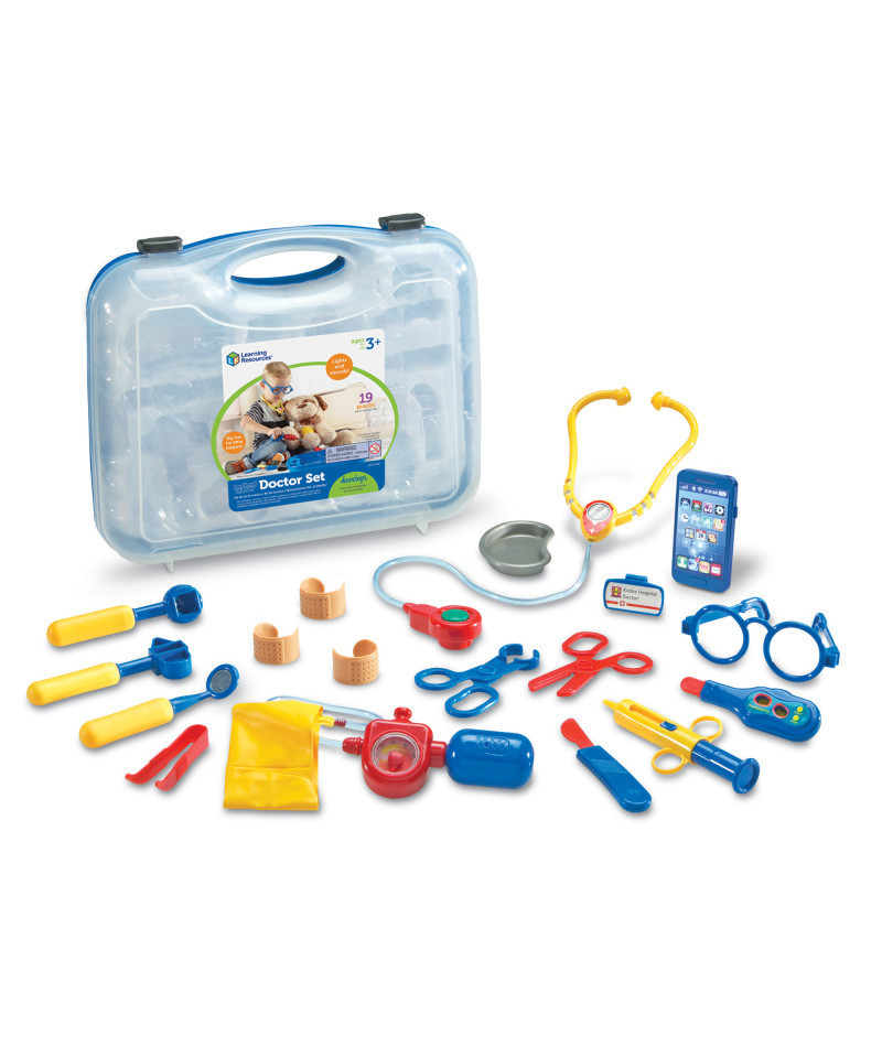 Features enough medical tools for the whole junior surgical staff to operate! Made from sturdy plastic, this set features a battery operated stethoscope, and realistic sounding cell phone. Provides the perfect way to ease children's anxieties about doctor visits. Plastic carrying case has a place for everything and provides great storage. Includes: Stethoscope, Cell phone, Forceps, 2 bandages, Eyeglasses, Name tag, Scalpel, Thermometer, Tweezers, Syringe, Blood pressure cuff, Scissors, Reflex hammer, Bedpan, Ear scope, Dental mirror. Case measures 14.5"L x 3.38"W x 12.5"H. Batteries: pager and stethoscope (included), cell phone requires 2 AA batteries, not included. Grades: PreK +.