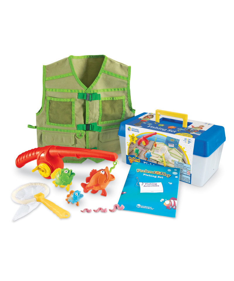 Reel in the big one! Bait the line to catch fish in 3 sizes. Little fishers role play hooking this catch of the day just like the family's grown up fisherman. Catching and releasing has never been this fun! All pieces store in the sturdy plastic tackle box. Activity guide features 6 pages of fishing themed activities. Fish are caught using magnets that are embedded for safety. Includes: tackle box, vest, fishing pole, 3 fish, 3 worms, net, and activity guide. Tackle box measures 13"L x 7"W x 6"H.