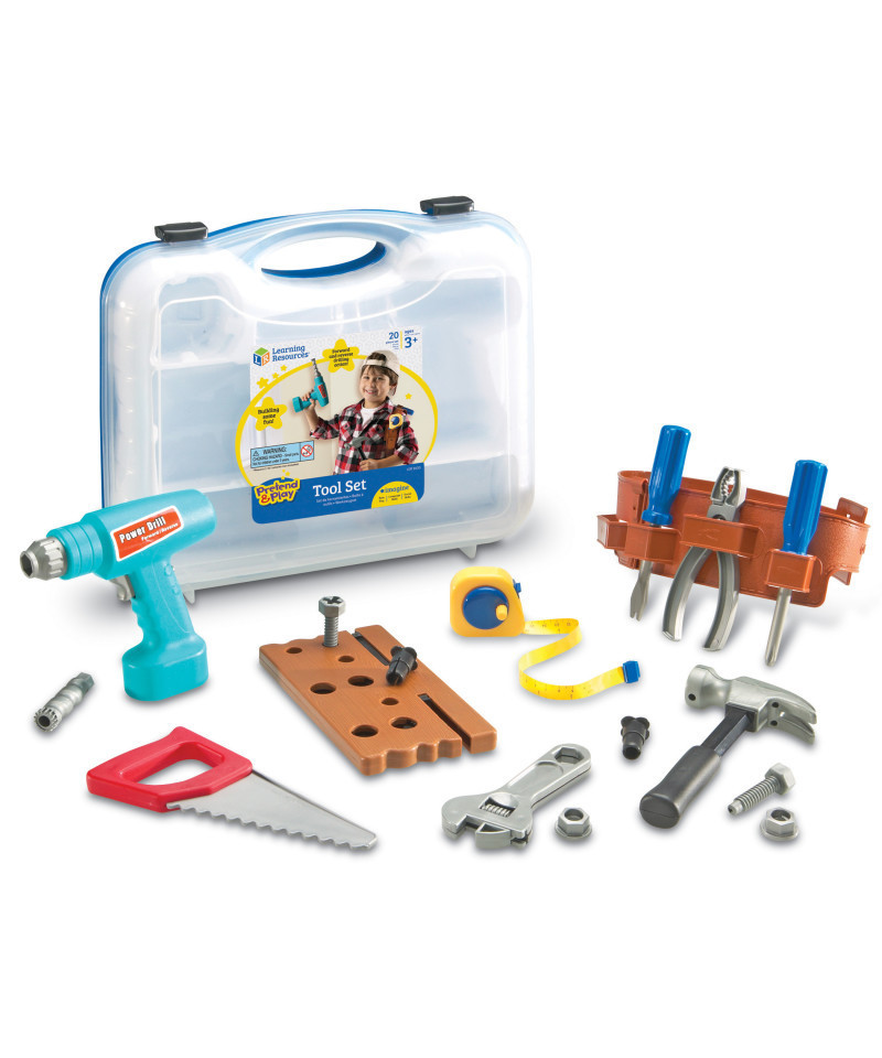 Everything young builders need for a day on the job! Inspires imaginative play about big construction jobs or home improvement projects with Mom and Dad. Includes hammer, saw, tape measure, nuts, bolts, board, battery-powered drill and tool belt. 20-Piece set is made of durable plastic and stores in a sturdy carrying case. Drill requires 2 AA batteries, not included. Ages 3-6 years.