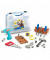 - 2-piece set includes durable plastic hammer, saw, tape measure, screwdrivers, nuts, bolts, wood board for drilling, battery-powered drill, handy tool belt, and sturdy carrying case