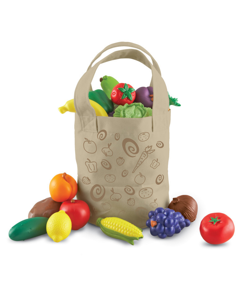 Fill a tote with nutritious, freshly designed product and invite early dramatic play! Made from soft, non-toxic plastic. Perfectly sized for small hands. Includes canvas tote, apple, tomato, strawberry, apricot, carrot, lettuce, pear, cucumber, berry cluster, plum, grapes, corn, banana, lemon, onion, and potato. Canvas tote measures 8"H x 9"W. Age: 2+/Grades: Toddler+.