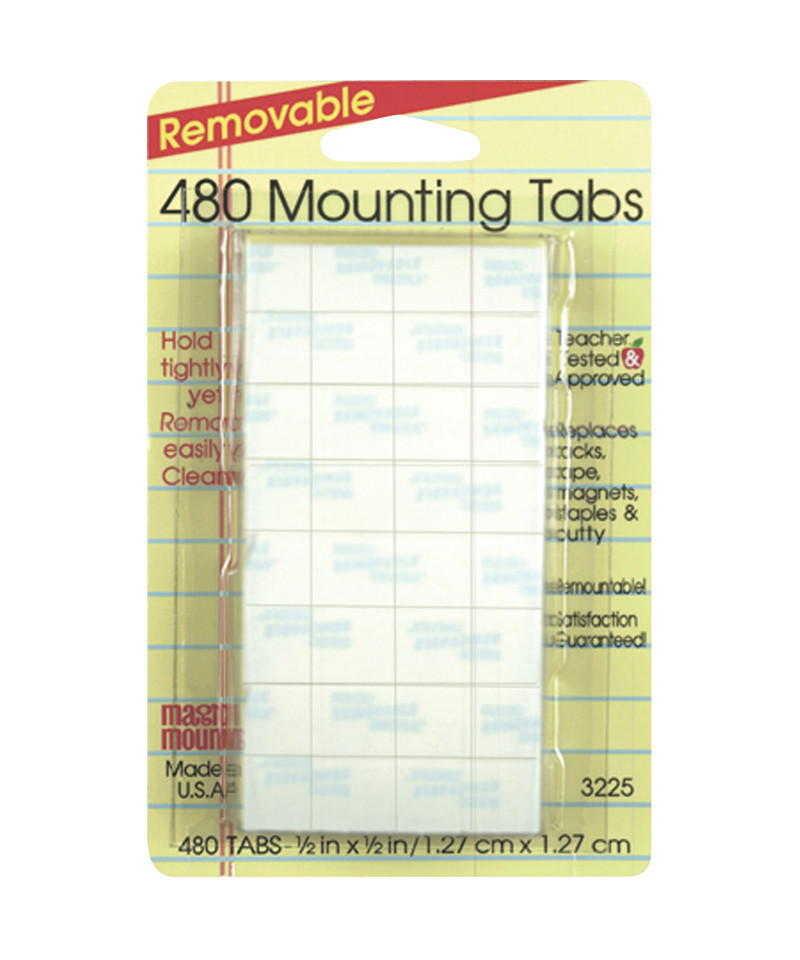 Our revolutionary adhesive bonding system secures tightly to most surfaces including drywall, painted block, brick, glass, tile, paneling and most other wall surfaces. And as one of the "original" removable adhesives, it removes cleanly with no residue, oily spots, or marring of walls... guaranteed! These wall savers get an "A." Teacher tested and preferred, this remarkable removable adhesive holds securely and removes cleanly up to 2 years. Removable Mounting Tabs measure 1/2" x 1/2". Each pack contains 480 Mounting Tabs.