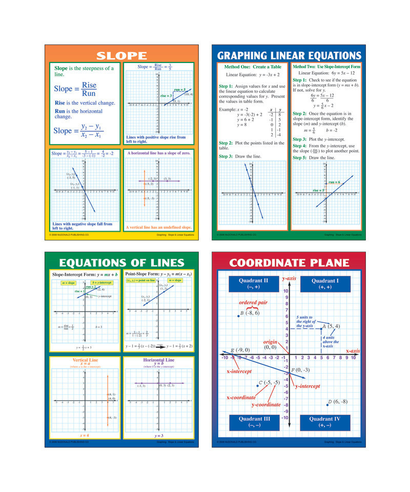 These informative posters help teach students about coordinate planes, equations of lines, slope, and methods for graphing linear equations. Includes 4 posters. Each poster measures 17" x 22".