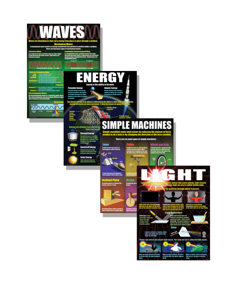 Students learn about types and properties of waves, the design and effectiveness if simple machines, the characteristics and behaviors of light, and the usefulness of various forms of energy. Includes 4 posters. Each poster measures 17" x 22".